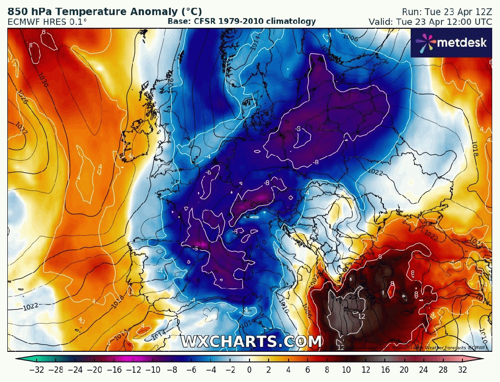 Ma per capire veramente se è freddo oppure è la nostra capacità individuale che ha perso la sensibilità di adattamento, bisogna far riferimento alle serie climatologiche, per confrontare le temperature di questi giorni con l’andamento del mese degli ultimi 30 anni. Effettivamente martedì, 23 aprile, abbiamo raggiunto l’apice di questa irruzione fredda con un’anomalia negativa di -4/-5 °C riuscendo a spodestare il record giornaliero del freddo aprile 1991 di 4 decimi di grado.