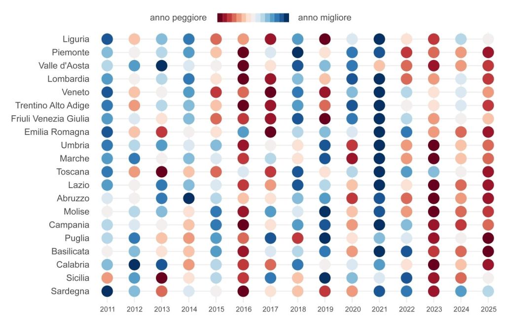 Ma il problema non è solo quantitativo: l’irregolarità nivometrica è ormai una costante. Alle quote più elevate si registrano accumuli superiori alla media, ma bisogna salire ben oltre i 2000-2200 metri affinché la neve riesca a conservarsi. Nel frattempo, alle quote medio-basse, la fusione precoce e le precipitazioni sempre più spesso sotto forma di pioggia stanno trasformando radicalmente l’ecosistema appenninico con una notevole ripercussione in tutte le stagioni. Le nevicate si fanno più rade, spesso sostituite da piogge intense che, al contrario della neve, non garantiscono un rilascio graduale di acqua meteorica nei mesi successivi e possono aumentare il rischio di fenomeni estremi.